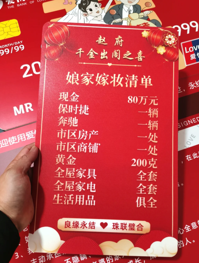 金石杂谈还看到一份女方嫁妆清单,真的是不把家人们当人,简单粗暴就是房产一套、商铺一套、保时捷、奔驰各一辆,现金80万,黄金200克大约20万。